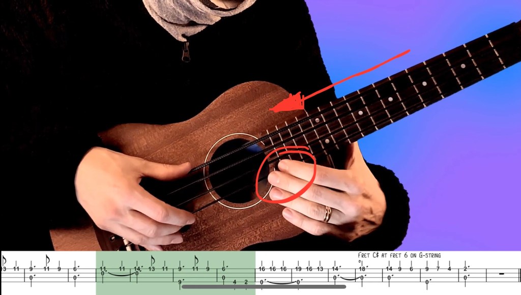 Tricky Bit 2: To get the C# you need to use a technique called false harmonics. The false harmonic technique is based on the same technique you use when playing a natural harmonic. You want to get the pitch that would have been find on the 18th fret. To get this note you fret the C# at fret 6 on the G-string. Then you find the spot exactly in the middle between the fretted C# and the bridge. You need to play that harmonic with you plucking hand. There are different ways of doing that. Here I’m using the first finger of my plucking hand on that “half-way-point”. (See Extra info!) I then pluck with the ring finger of my plucking hand. This will take some practice to find the right spot and get the note to ring and sound as close to the regularly fretted notes! Play slow and gradually add speed!